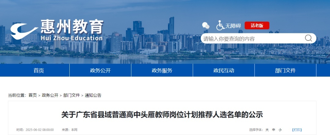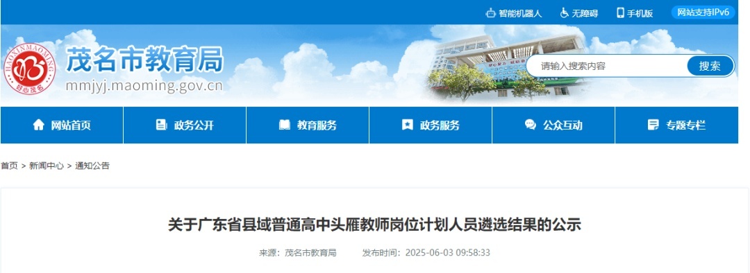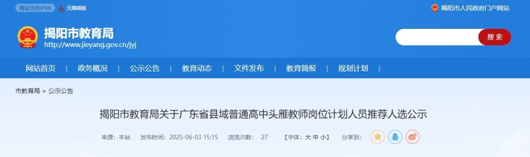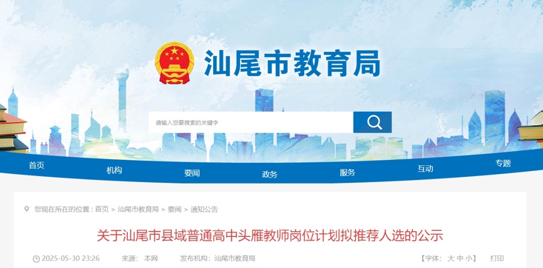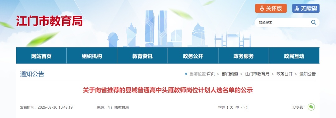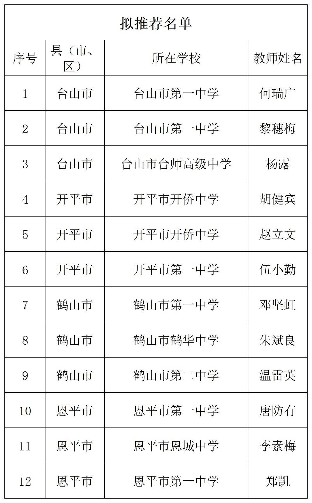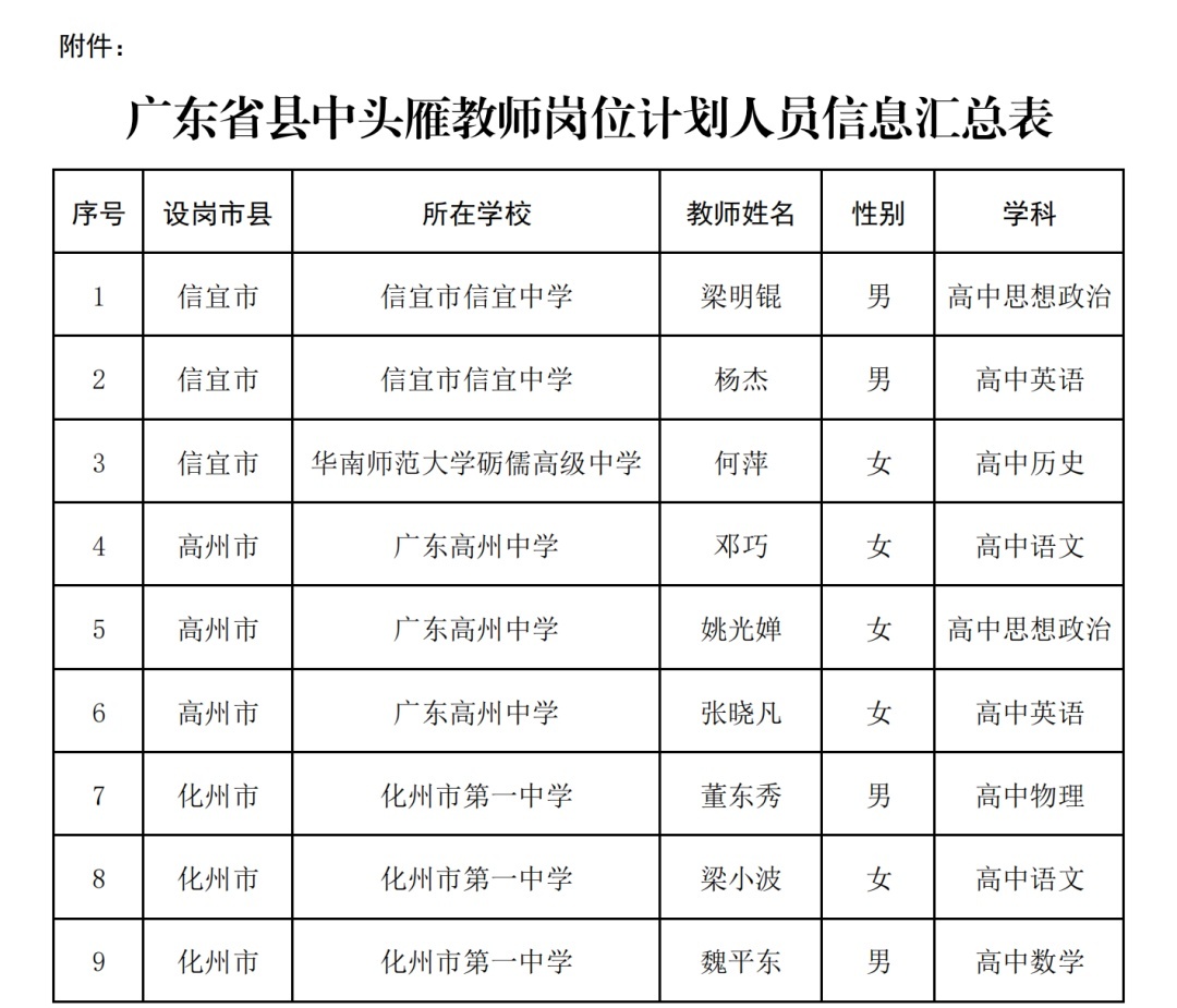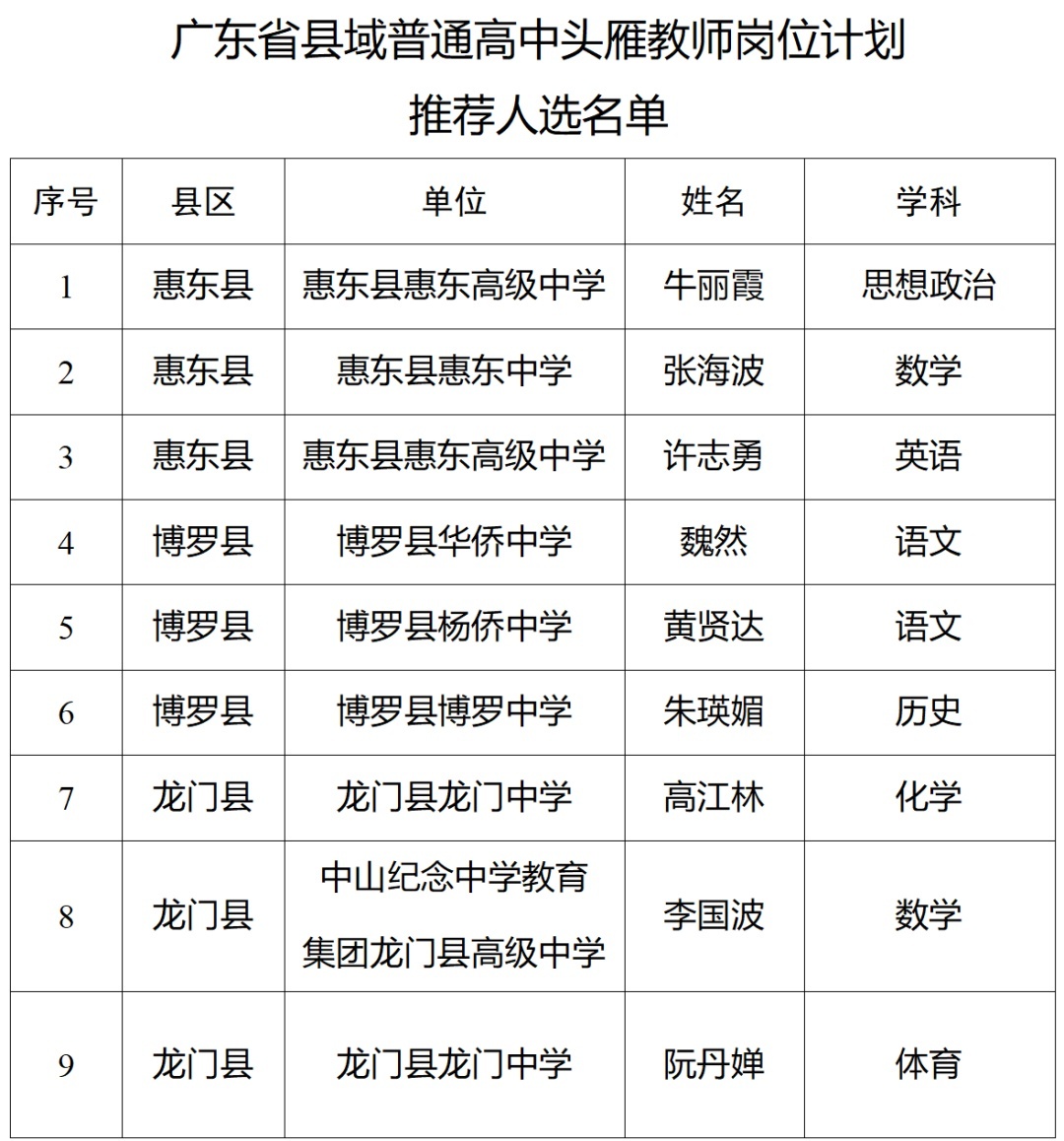 日前 教育部办公厅印发 《关于实施全国县域普通高中 头雁教师岗位计划的通知》 旨在培养一批县域高中教学领军人才 该计划实行3年聘用制管理 首批将选拔600名头雁教师 点此查看详情 近日 茂名、揭阳、惠州、江门、汕尾 陆续开始公示推荐人选名单 一起来看! 茂 名 原文如下: // 根据《广东省教育厅关于开展县域普通高中头雁教师岗位计划人员遴选工作的通知》精神,经教师个人申请、县(市)教育局组织遴选推荐、市教育局审核,现将我市县中头雁教师岗位计划人员遴选结果(共9人,名单见附件)予以公示。 公示期内如有异议,请通过电话或邮件向茂名市教师发展中心反映,并提供必要的佐证材料,以便核实查证。 公示时间:2025年6月3日--6月9日。 联系人:伍老师,电话:2270755,邮箱:mmsjys@163.com。 附件:广东省县中头雁教师岗位计划人员信息汇总表.pdf 茂名市教育局 2025年6月3日 揭 阳 原文如下: // 根据《广东省教育厅关于开展县域普通高中头雁教师岗位计划人员遴选工作的通知》,拟推荐普宁市第二中学郑楚彬、普宁市华侨中学蔡洁玲、普宁市城东中学林少彬、揭西县河婆中学温会暖、揭西县棉湖中学吴晓辉、揭西第一中学曾娜、惠来县第二中学黄奕珊、惠来慈云实验中学方佳发、惠来县第一中学郑荣坤等9名教师为广东省县域普通高中头雁教师岗位计划人员推荐人选。现予以公示。公示时间从2025年6月4日至2025年6月10日止。若对公示对象有异议,请电话或书面向市教育局人事科反映。以个人名义反映的应签署或自报本人真实姓名,并留下联系电话;以单位名义反映的应加盖本单位印章。反映公示对象的情况和问题,应坚持实事求是的原则,不得借机诽谤和诬告。 受理部门:揭阳市教育局组织人事科 受理电话:0663-8724407 地址:揭阳市榕城区临江北路揭阳市教育局 邮编:522031 揭阳市教育局 2025年6月3日 惠 州 原文如下: // 根据《广东省教育厅关于开展县域普通高中头雁教师岗位计划人员遴选工作的通知》要求,经个人申报、县教育部门审核、市教育局组织专家审核,拟定惠东县惠东高级中学牛丽霞等9人为广东省县域普通高中头雁教师岗位计划推荐人选,现予以公示,公示时间从2025年6月3日至6月9日,共5个工作日。公示期间,如对拟定名单有异议,请电话或书面向我局反映(个人请用真实身份,单位来件请加盖公章)。反映公示名单的情况和问题,要坚持实事求是的原则,不得借机诽谤和诬告。 市教育局联系部门及电话: 市教师发展中心:2261269。 地址:惠州市麦地路2号。 惠州市教育局 2025年6月2日 附件 广东省县域普通高中头雁教师岗位计划推荐人选名单.docx 江 门 原文如下: // 根据《广东省教育厅关于开展县域普通高中头雁教师岗位计划人员遴选工作的通知》,经个人申报、县(市、区)教育局推荐、江门市教育局审核,现将拟向省推荐的县域普通高中头雁教师岗位计划人选名单(详见附件)予以公示。公示期自2025年5月30日至6月6日。 如对公示内容持有异议,可通过来信、来电等形式向市教育局反映。反映与公示内容相关的情况和问题应坚持实事求是原则。以个人名义反映情况的,请提供真实姓名、联系方式和反映事项证明材料等;以单位名义反映情况的,请提供单位真实名称(加盖公章)、联系人、联系方式和反映事项证明材料等。对于不签署真实姓名及联系方式,且无相关材料的,一律不予受理。 联系电话:3503920。 附件:拟推荐名单 江门市教育局 2025年5月29日 汕 尾 原文如下: // 根据《广东省教育厅关于开展县域普通高中头雁教师岗位计划人员遴选工作的通知》要求,经自下而上逐级推荐、市教育局研究,拟推荐8名教师为县域普通高中头雁教师岗位计划人选。现将拟推荐人员名单予以公示,公示时间为2025年6月3日至6月9日。 公示期间如对推荐人选有异议,可向市教育局人事科反映(地址:汕尾市区红海中路市教育局402,邮政编码:516600,联系人:李炯峰,联系电话:3390663)。来电或来信请用真实姓名、身份并附联系方式,否则不予受理。 附件:汕尾市县域普通高中头雁教师岗位计划拟推荐人选名单 汕尾市教育局 2025年5月30日 *有什么想说的,快来给小媒君留言* 来源:广东教育传媒综合茂名市教育局、揭阳市教育局、惠州市教育局、江门市教育局、汕尾市教育局 转载时请标明转自广东教育传媒,投稿或商业合作回复关键词 投稿/合作 |